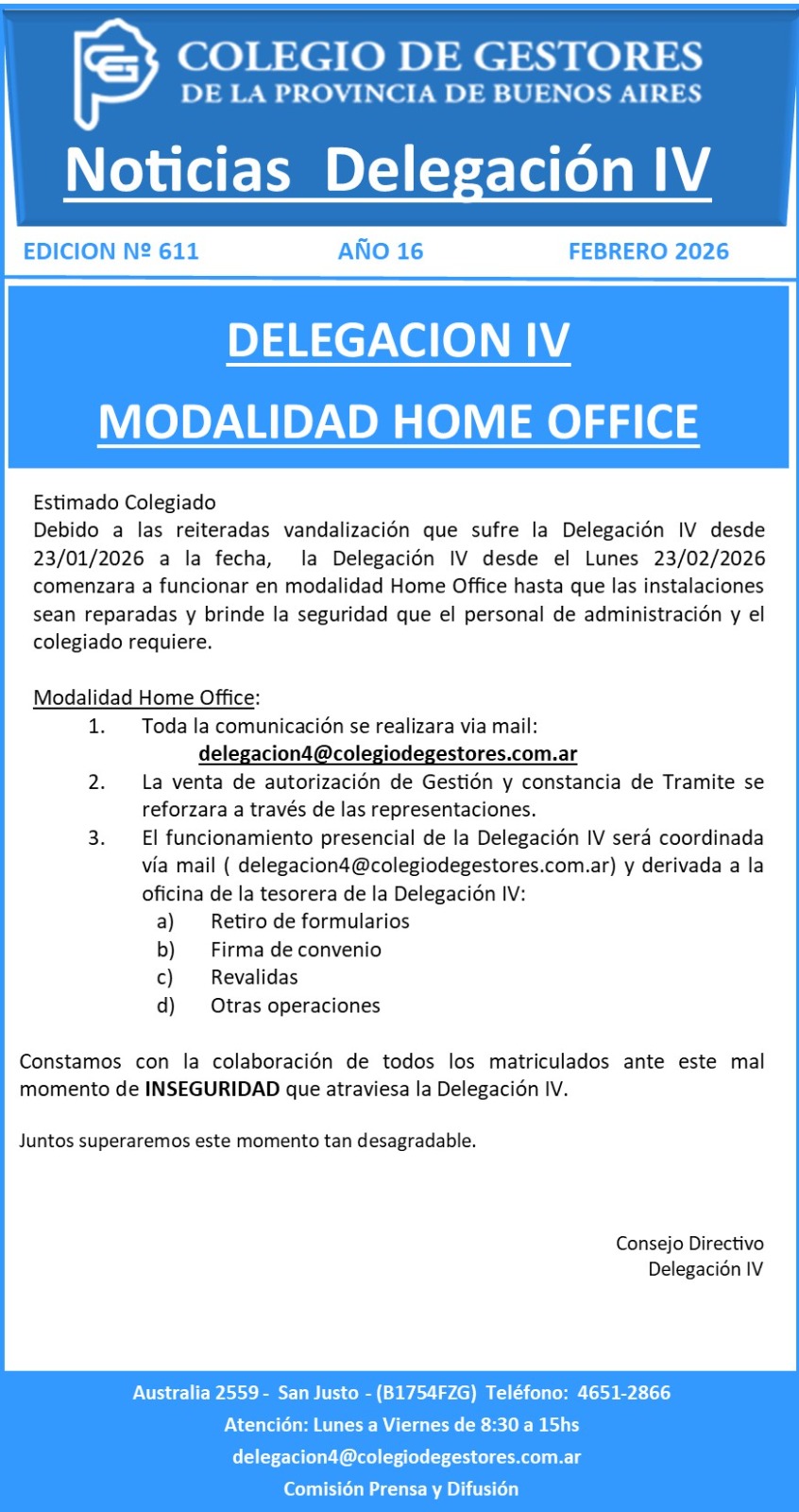 Debido a las reiterada vandalización del frente de la Delegación IV que sufrió desde el 23/1/2026 a la fecha, la misma permanecerá cerrada desde el 23/2/2026, funcionando en modalidad Home [...]
